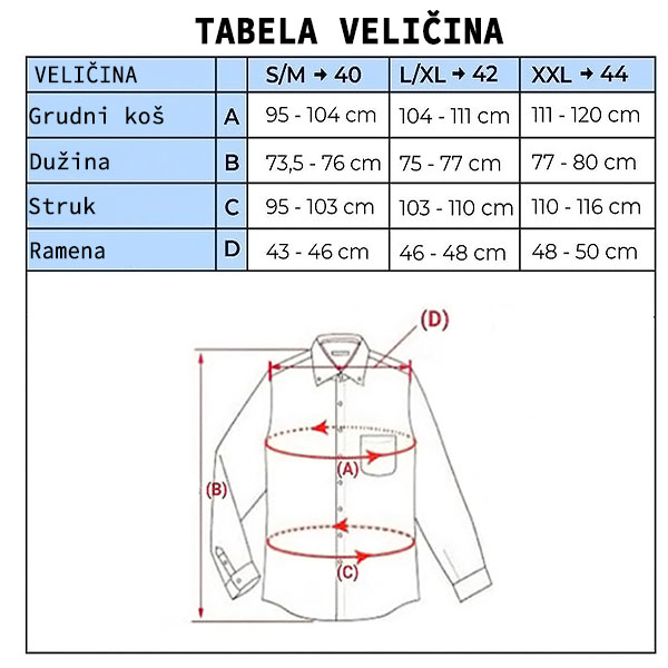 Košulja se dobro prilagođava telu, blago se sužavajući od grudi ka struku.